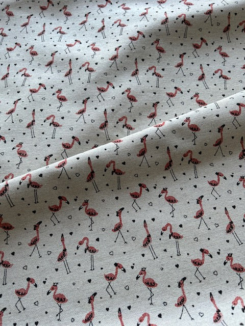 Cute pink flamingos are playfully dotted against a cream background on this medium weight canvas which is ideal for bags or home furnishings. Alternatively, this would make a fun skirt if a slightly heavier weight fabric is required.